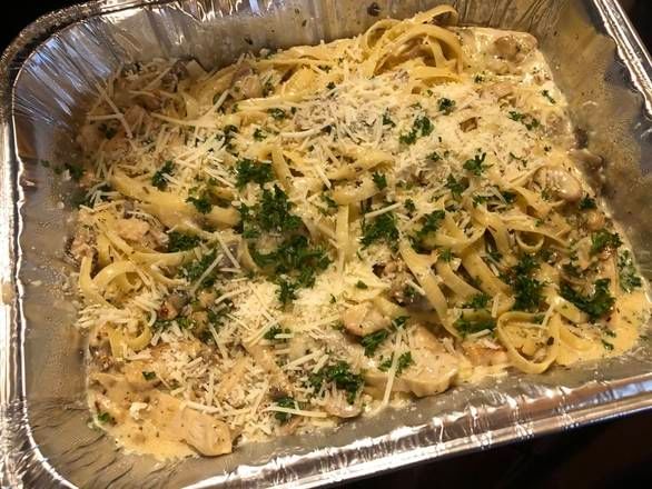 Fresh mushrooms and grilled chicken in a parmesan alfredo