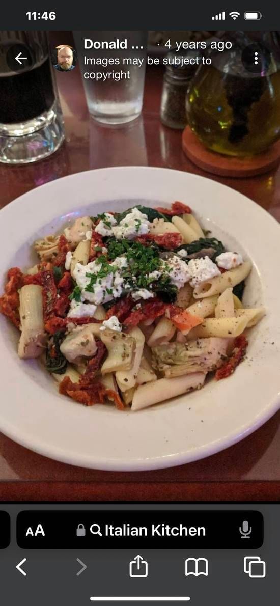 Chicken, mushrooms, onions, bell peppers and garlic over pasta with a spicy marinara topped with gorgonzola