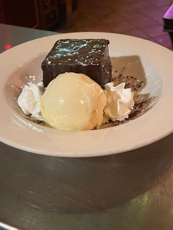 A heated 4 layer chocolate brownie with 2 layers of chocolate ganache and 2 layers of rich chocolate brownie drizzled with caramel and white chocolate. Comes with vanilla ice cream